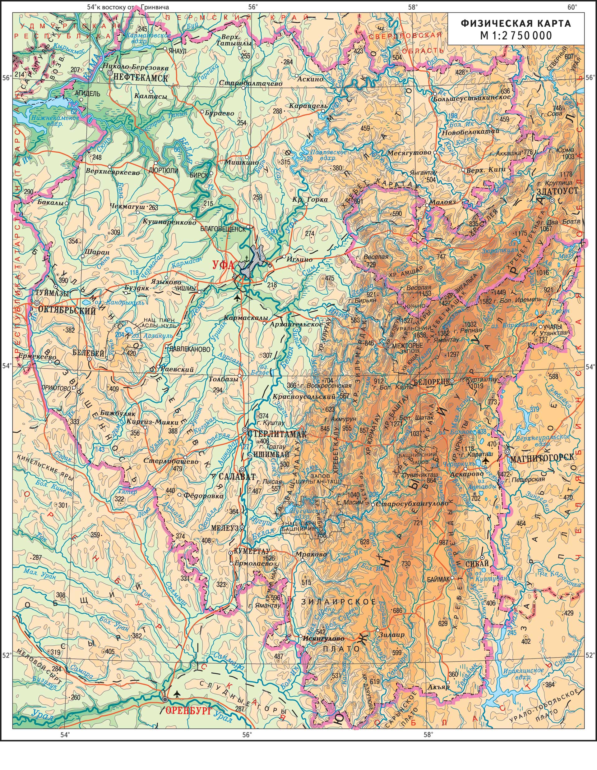 РЕСПУБЛИКА БАШКОРТОСТАН (Башҡортостан Республикаһы), Башкортостан (РБ), субъект Российской Федерации. Находится на Юж. Урале. На С. граничит с Пермским краем, С.‑В. — Свердловской областью, В. — Челябинской областью, Ю. — Оренбургской областью, З. — Респ. Татарстан, С.‑З. — Респ. Удмуртия. Входит в Приволжский федеральный округ. Пл. — 142,9 тыс. км2. Столица — Уфа.
