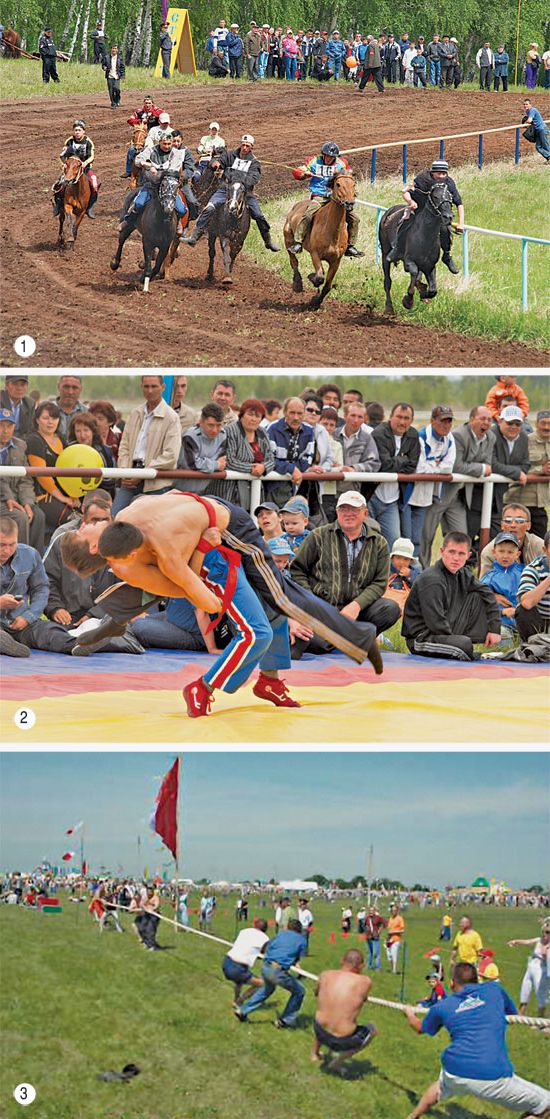 САБАНТУЙ (hабантуй, от баш. һабан — плуг, туй — праздник), у башкир традиц. праздник. До кон. 19 в. проводился в весенне-летний период до начала пахоты после каргатуя, позднее — после завершения посевных работ. Традиционно С. проходил в каждом ауле, приглашались также жители соседних деревень. Накануне юноши собирали призы для С. и продукты для угощения гостей. На поляне ок. деревни оформляли праздничную площадь (майдан): застилали разноцветными паласами и ткаными скатертями, с юж. стороны делали навесы и сооружали шатры, в центре устанавливали столб (ҡолға, бағана) с укреплёнными наверху подарками (сапоги, гармонь, вышитые полотенца, платки и др.). Утром мужчины около могил предков проводили обществ. моления с просьбой об обильном урожае и благопожеланиями. В нек‑рых местах праздник начинали с исполнения обрядов, символизировавших оплодотворение земли (прокладывали первую борозду, сеяли). Мужчины были главными действующими лицами на празднике, поскольку посев зерновых считался исключительно мужским делом. После полудня проходили скачки (байге): наездники скакали вокруг холма, что должно было способствовать быстрому росту и созреванию урожая. Победителем считался тот, кто первым срывал привязанный к шесту белый платок, вышитый самой молодой замужней женщиной. Проводили также соревнования в беге (йүгереү), по борьбе (курэш), перетягиванию каната (арҡан тартышыу), подъёмам по наклонному шесту и на столб с подарками, в беге в мешках и др.; победители награждались призами (жеребец, баран и др.). Участники праздника состязались в исполнении нар. песен, плясок, игре на курае, кубызе и др. народных музыкальных инструментах. С. заканчивался общей праздничной трапезой, для к‑рой готовили бишбармак, казы и др. блюда башкирской кухни. Праздник способствовал сохранению единства баш. общины и укреплению межродовых связей. С 1991 С. имеет статус общересп. праздника; периодически также проводится в Москве, С.-Петербурге и регионах РФ, в к‑рых имеются диаспоры башкир. Бытовал у мн. тюркоязычных народов Ср. Азии и Сибири.