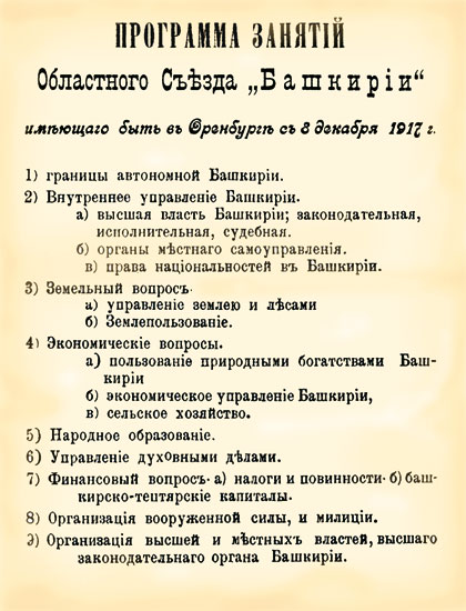 1‑й В.к., 1‑й Всеобщий съезд башкир, состоялся 20—27 июля в г.Оренбург. Созван по инициативе Бюро союза баш. народа (см. Башкирское областное бюро). В работе съезда участвовало 70 делегатов. Съезд заслушал отчётный доклад Бюро союза баш. народа о движении башкир и его месте в нац.‑освободит. движении др. народов, доклады о гос. управлении, земле, отношении к Первой мировой войне, организации нац. вооруж. формирований, просвещении, правах женщин и др. Съезд направил телеграмму Всероссийскому мусульманскому совету (Казань) о необходимости провозглашения нац.‑терр. автономии Башкортостана и приветствовал открытие 1‑го Всекирг. (казах.) съезда (Оренбург, 21—26 июля). Учредил Башкирское центральное шуро (БЦШ) и избрал исполнит. комитет. Съезд принял резолюции о нац.‑терр. автономии Башкортостана в составе Рос. федеративной дем. республики, представительстве башкир во Всерос. мусульм. совете, деят‑сти волостных шуро, об участии в выборах во Всероссийское Учредительное собрание, о прекращении войны без аннексий и контрибуций, организации нац. вооруж. формирований, социализации земли и возвращении зем. участков, отторгнутых у башкир к 1917, национализации Караван-Сарая, проведении переписи баш. населения, учреждении нац. валютного и имуществ. фонда, всеобщем бесплатном ср. образовании, равноправии мужчин и женщин. Было принято решение о проведении нового съезда в авг. или сент. в Уфе.
